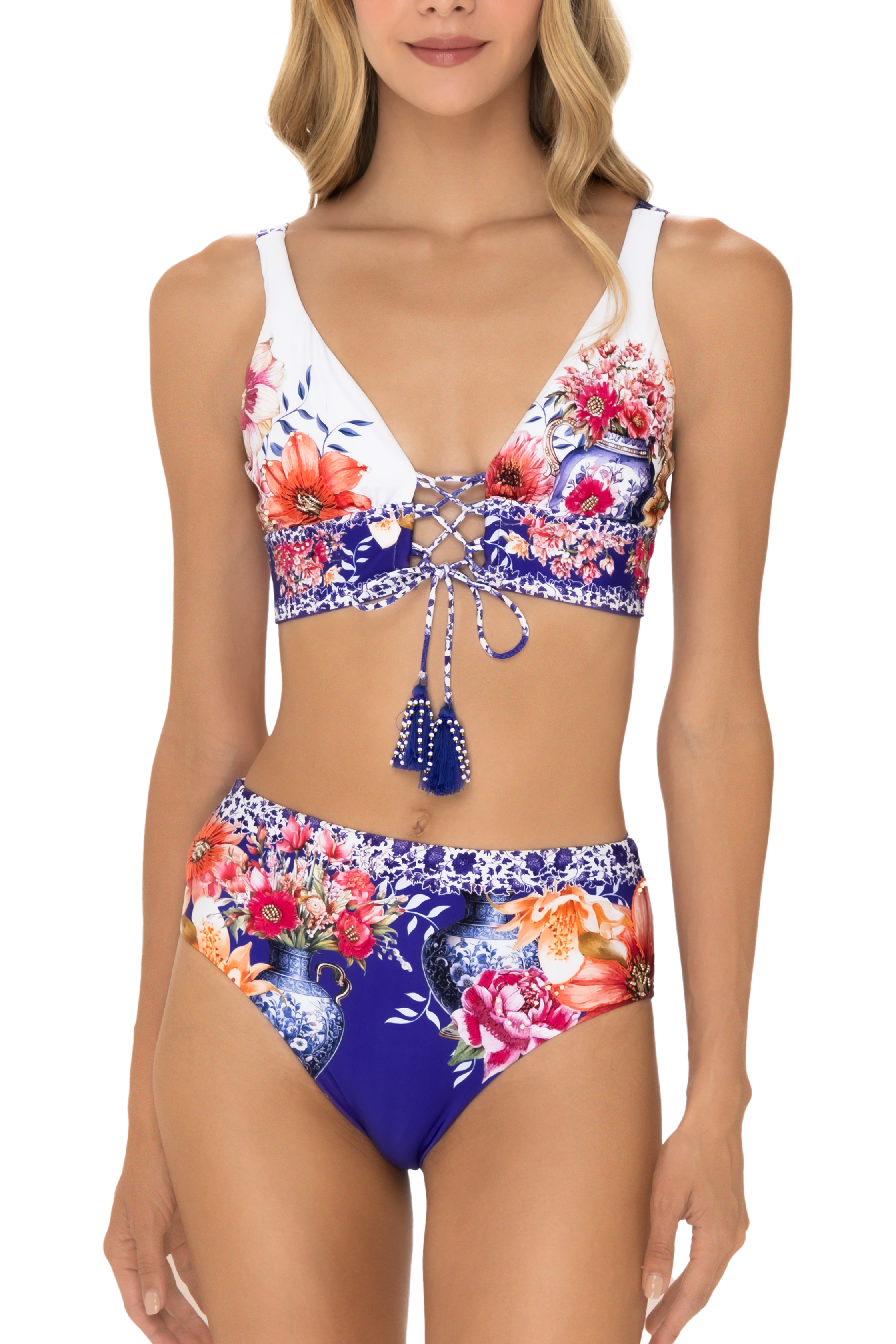 Vestido de baño / Panty, panty con fruncido posterior y estampado floral que realza la silueta con sutileza. Su confección artesanal con bordados y detalles decorativos combina feminidad y sofisticación en una pieza única.