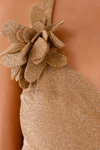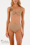 Vestido de baño / Top, top triángulo en tono dorado con destellos metálicos que evocan la luz del sol sobre el agua. Su tejido brillante resalta la piel con calidez y aporta un toque de lujo natural.