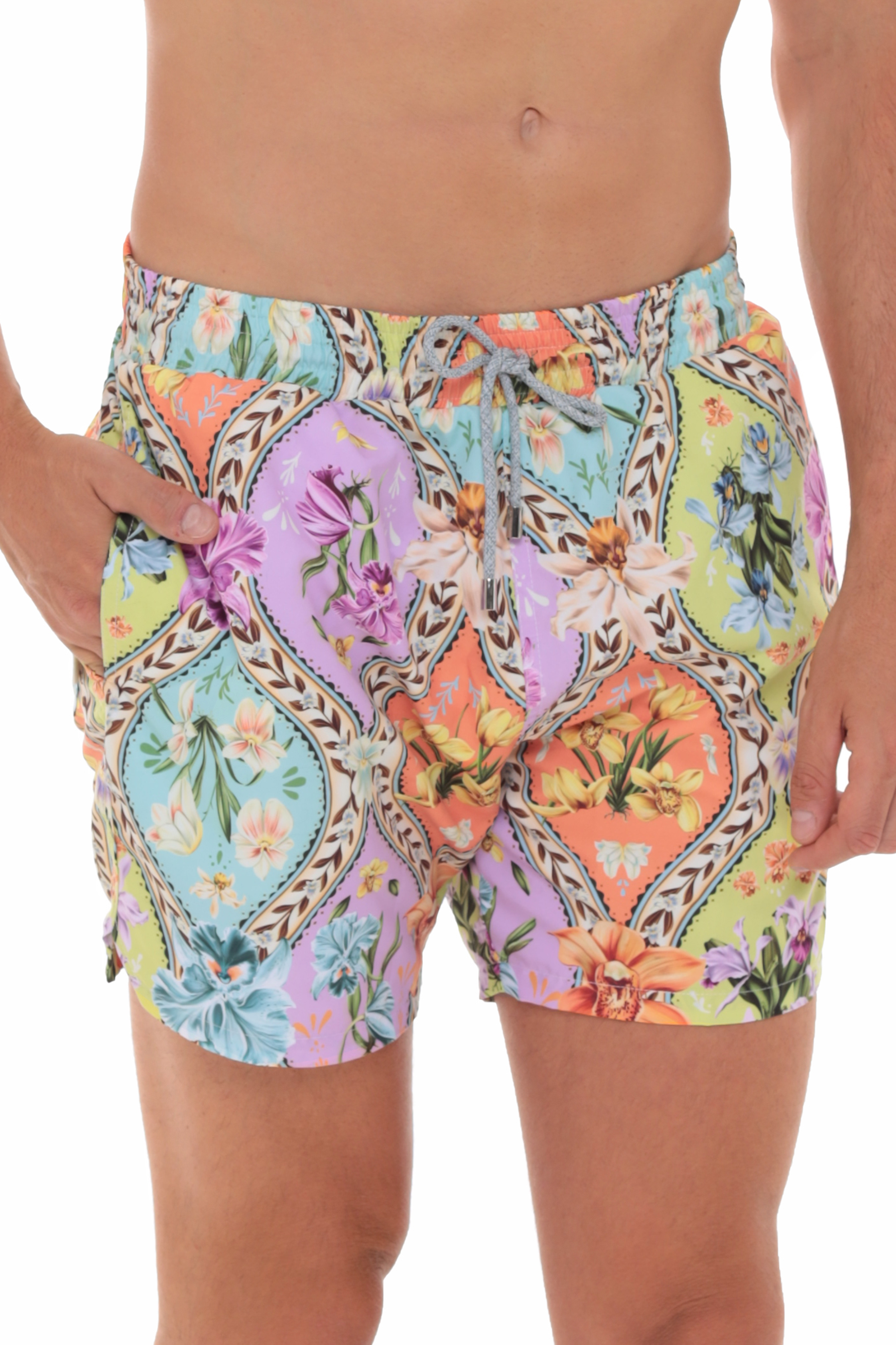 Pantaloneta hombre, estampado Atlas, con malla interna, tela anti fluidos, cordón ajustable a la cintura con puntera. Bolsillos laterales y uno posterior con cierre en velcro