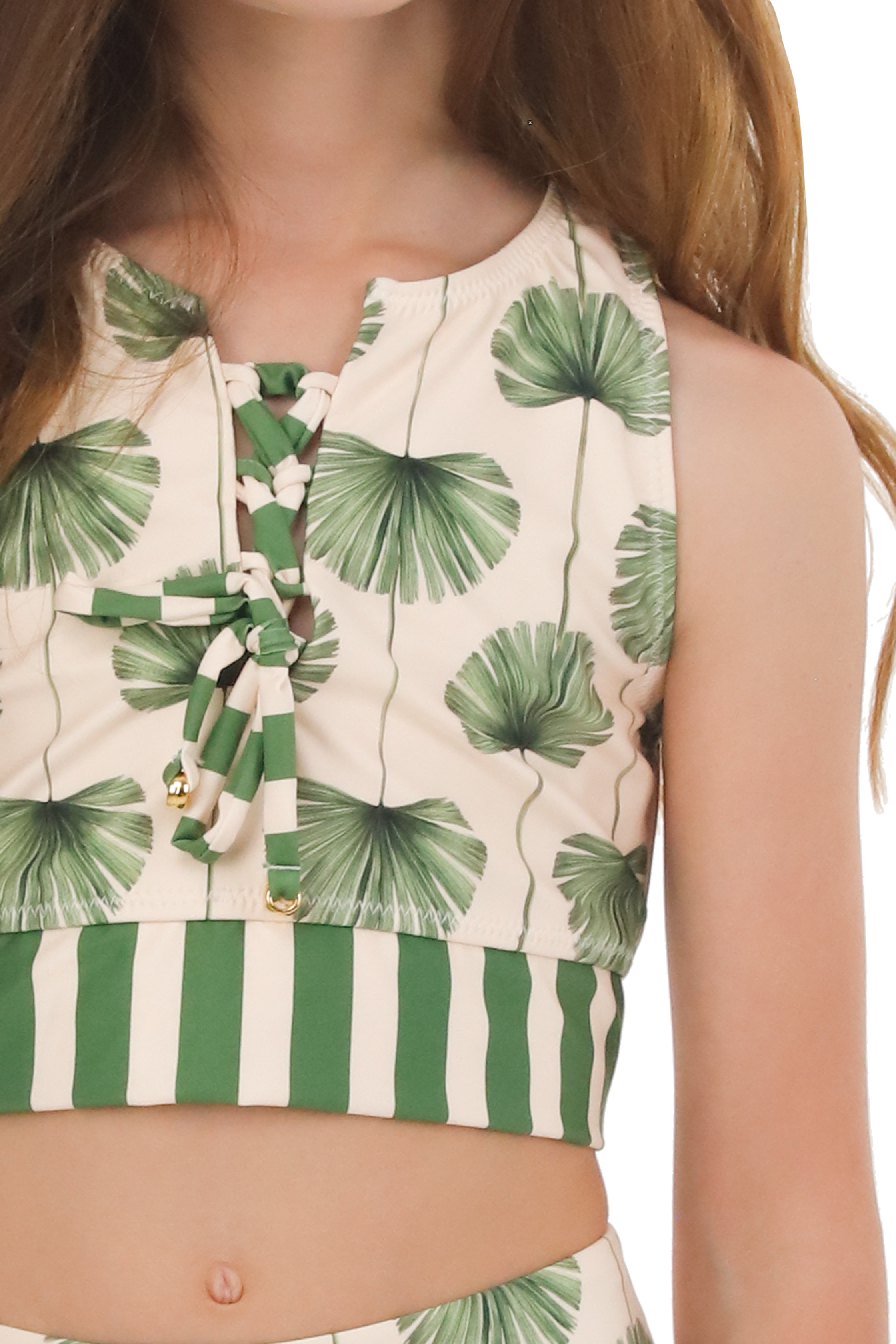 Vestido de baño / Set Kids, conjunto de camiseta y bottom con diseño de inspiración orgánica que evoca frescura y ligereza. Su silueta cómoda permite libertad de movimiento, ideal para acompañar las actividades al aire libre con confort y estilo.