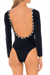 Vestido de baño / Entero, traje de baño de una pieza con manga larga y escote profundo en la espalda, decorado con delicadas caracolas. Su diseño minimalista combina elegancia, sofisticación y un toque artesanal único.