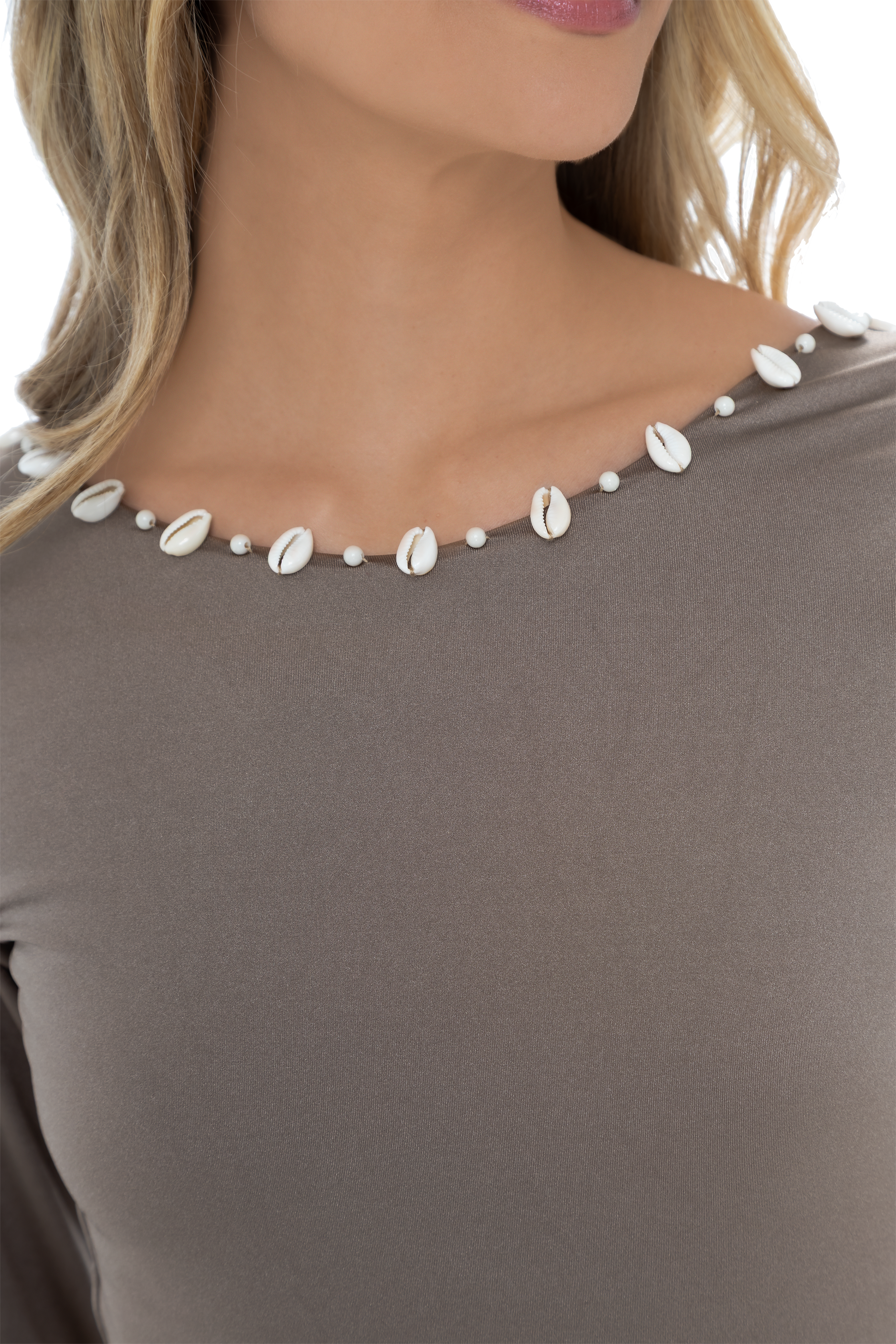 Vestido de baño / Entero, traje de baño de una pieza con manga larga y escote profundo en la espalda, decorado con delicadas caracolas. Su diseño minimalista combina elegancia, sofisticación...